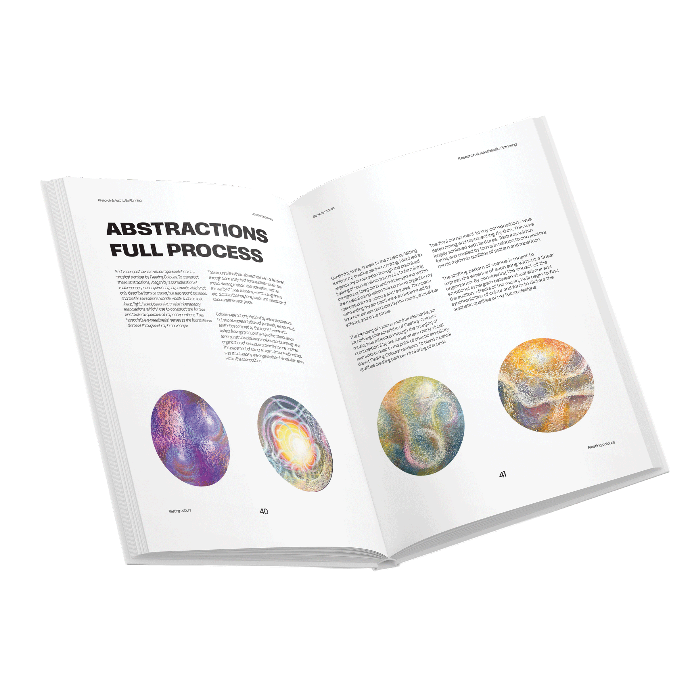 Within this publication I explore relationships between sensory experiences by conducting methods of visually designing music. Through experimental research into form, color and typography I explore the inter representational qualities of sound, form, color and tone to devise a visual identity directly informed by Fleeting Colours musical style.